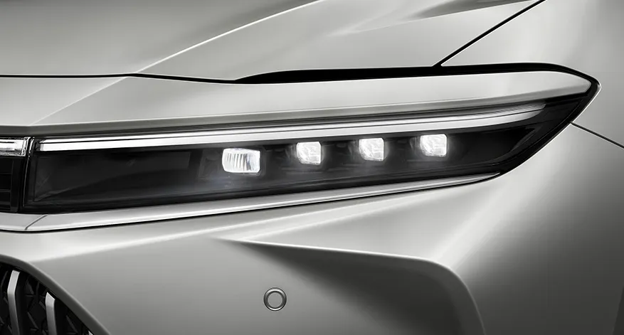 また、薄型LEDヘッドライトとその上の水平に伸びるデイライトが、フロントのデザインを際立たせます。このデザインは、洗練された印象を与えつつ、クラウンの強い存在感を示しています。