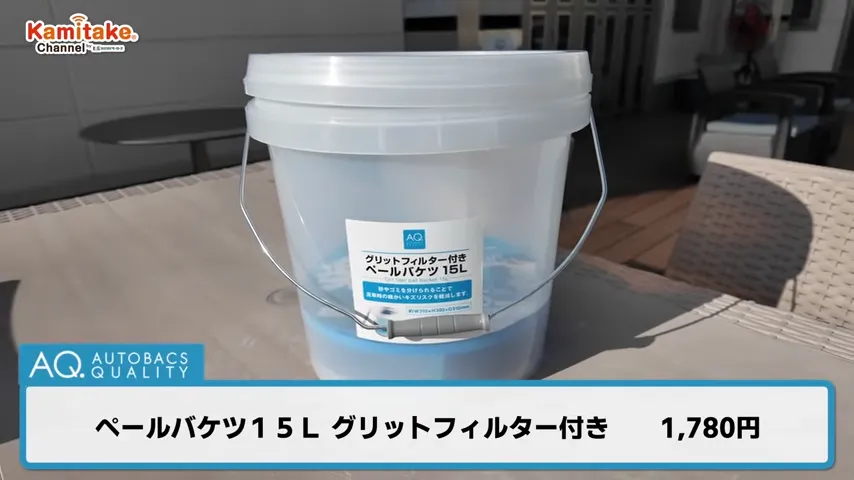 今回使用したのは、蓋つき・底面フィルター付きの多機能バケツ。洗車好きでも満足できる仕上がりになっています。