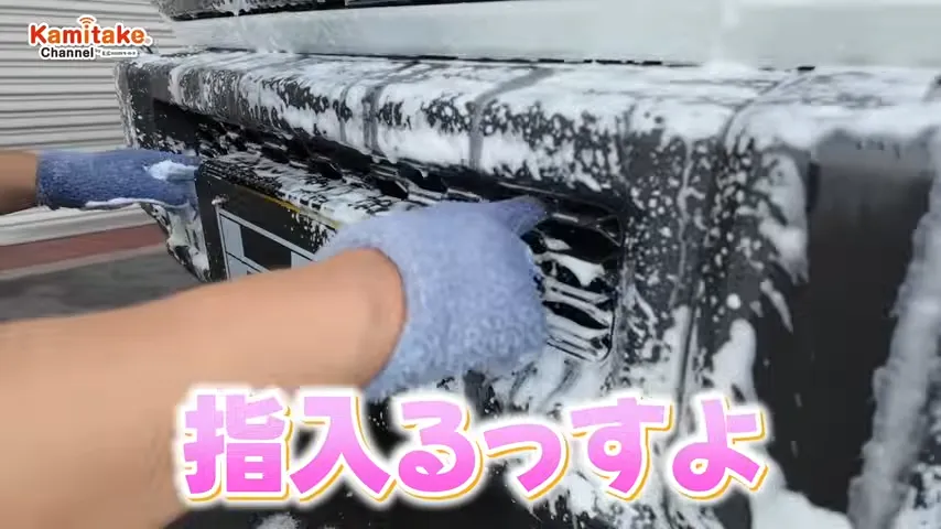 指で洗うとハニカム形状のグリルも洗いやすかったです。最近の車のグリルは、ハニカム構造になっているモデルが多く、従来のスポンジでは届かない領域が増えています。