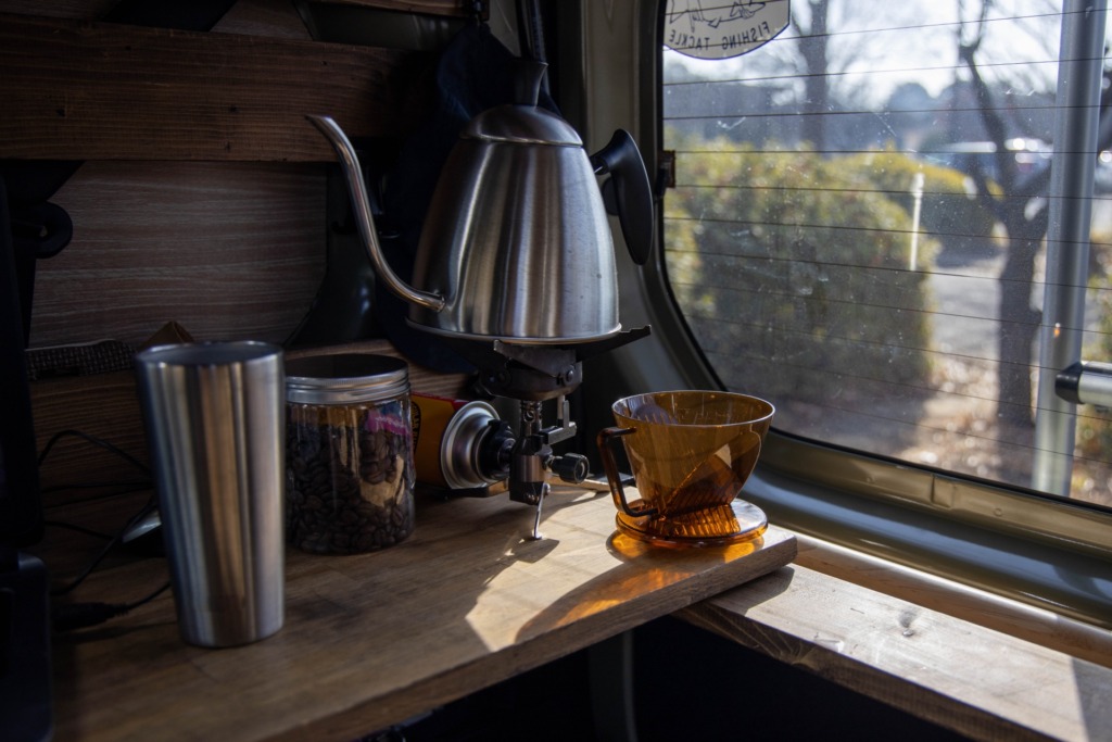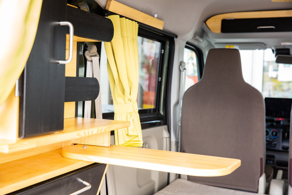 棚やテーブルなどはすべて木材でできているため、長期間使用できます。雨の日、濡れたものを室内に持ち込んでも木材が湿気を吸って吐いてくれるので丈夫。気候が優れないときの車中泊でも、快適に過ごせる室内に変化します。
