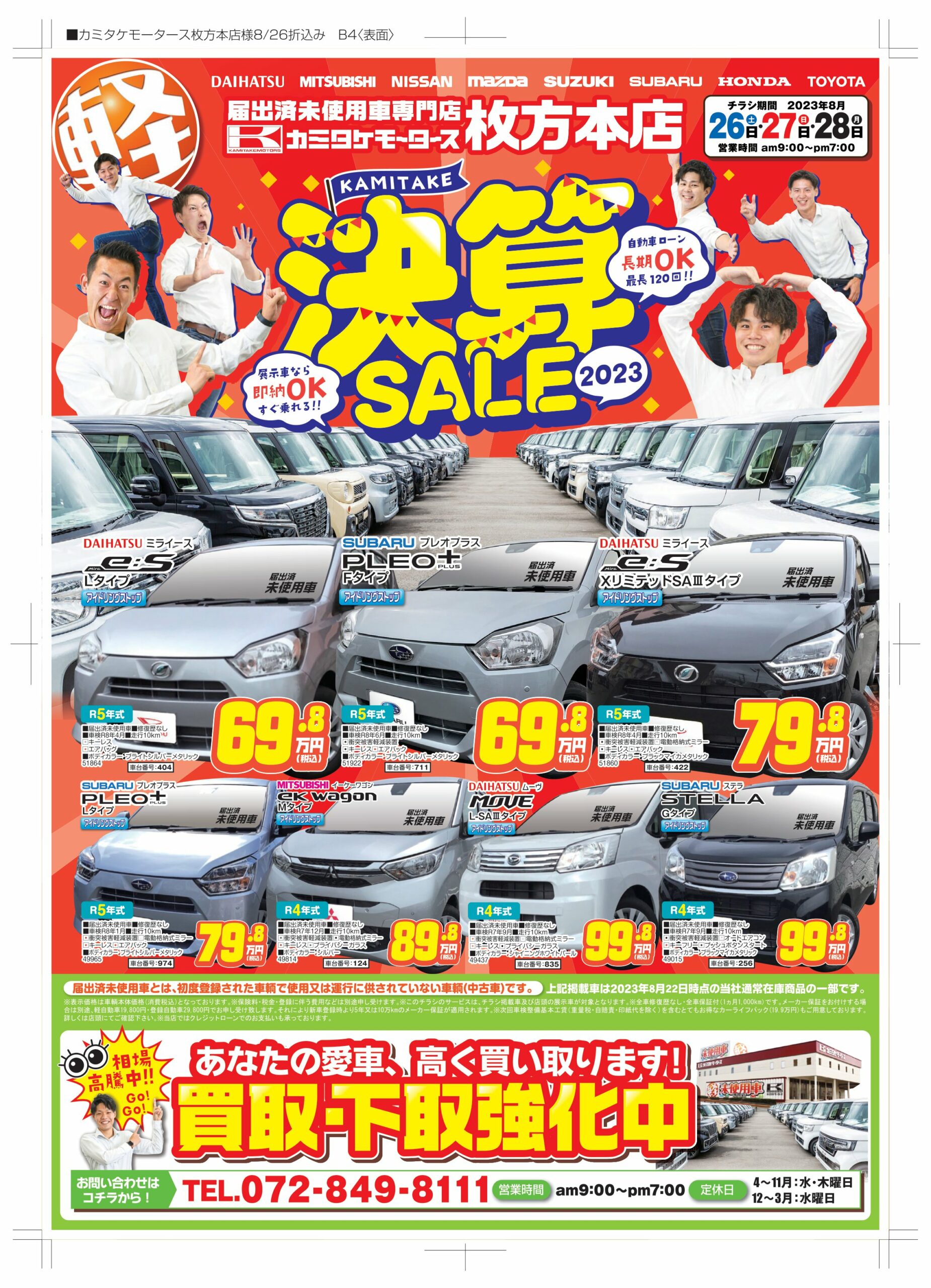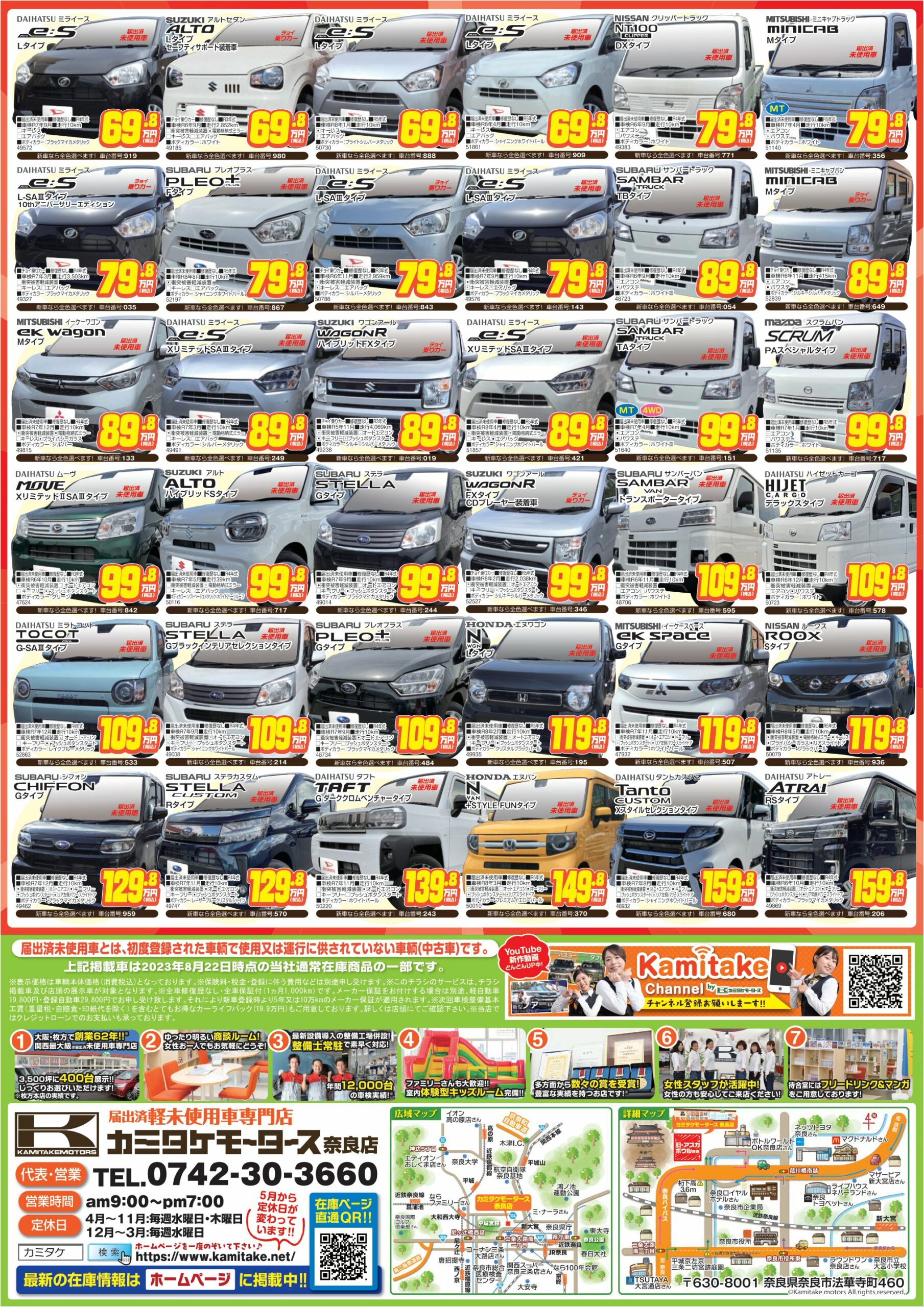 チラシには軽未使用の一部を記載しておりますが、普通車も多数取り揃えております。