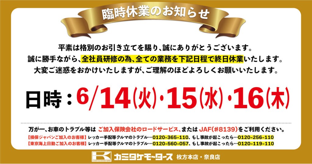 いつもカミタケモータースをご利用いただきまして、誠にありがとうございます 誠に勝手ながら全社員研修の為、 下記日程を臨時休業とさせていただきます。 【 日時 】 【 対象店舗 】 6月14日(火)・15日(水)・16日(木) 全店舗 車のトラブル発生時の... -